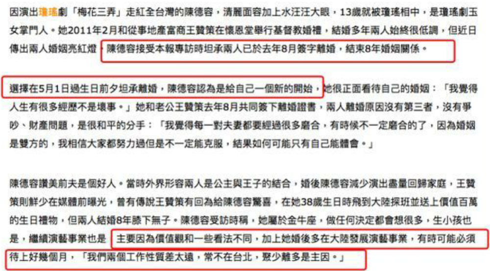 那么他们究竟是因为什么离婚的呢?其实是他们的价值观产生了分歧,还有就是两个人工作的不同,陈德容是演员而前夫是做地产的,所以就会经常聊不到一块去,而且夫妻俩经常会异地,所以感情也就开始慢慢的变淡了,这些原因确实会导致夫妻双方会产生离婚的想法。他们俩离婚的决定也得到了家人的谅解,离婚也并不是男方提出来的,是陈德容主动提的,而且这个想法她也不是冲动下产生的,她其实已经思考了很久才决定的。
