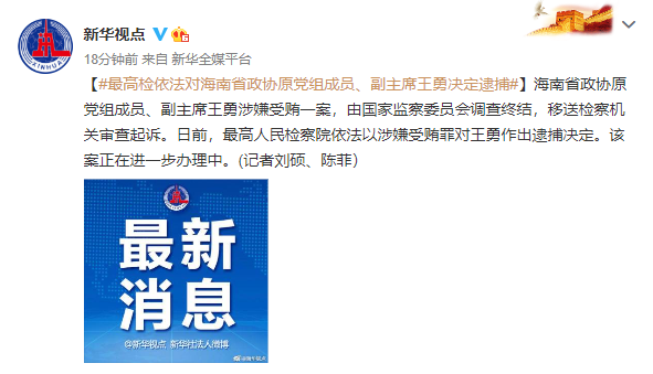 海南省政协原党组成员、副主席王勇涉嫌受贿一案,由国家监察委员会调查终结,移送检察机关审查起诉。日前,最高人民检察院依法以涉嫌受贿罪对王勇作出逮捕决定。该案正在进一步办理中。