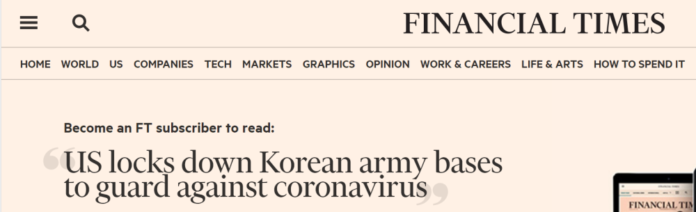据英国《金融时报》28日报道,美国军方已经封锁其在韩国的军事基地。报道表示,此举是为了保护驻韩美军不受新冠病毒疫情影响。